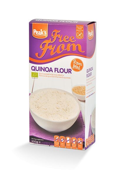 Quinoameel van Peak's. Quinoa is een glutenvrij zaad wat je in vermalen vorm voor van alles kunt gebruiken. Gebruik het om bijvoorbeeld heerlijke pannenkoeken te bakken of verwerk het in brood of koekjes.